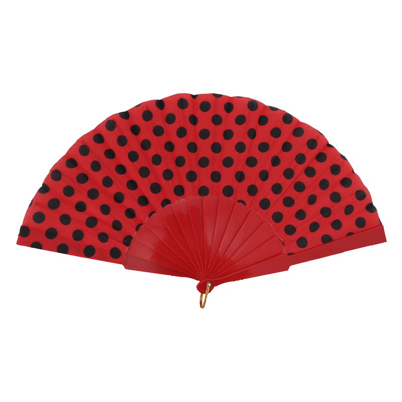 Abanico de color rojo, a lunares negros, ideal para abanicarte en tu próxima fiesta de disfraces, sobre todo si es de temática flamenca, sevillana o rociera. Si vas de flamenca, o faralae, este es un complemento que no te podrá faltar....