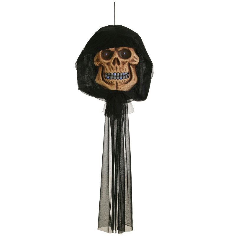 Colgante decorativo con forma de calavera envuelta en una tétrica gasa negra, con iluminación en los ojos, que pondrá el toque de horror a tu decoración de Halloween. Impresiona a tus amigos con este complemento de decoración que cuelga hasta 123 cm y dale a tu casa, comercio o pub un toque terrorífico.