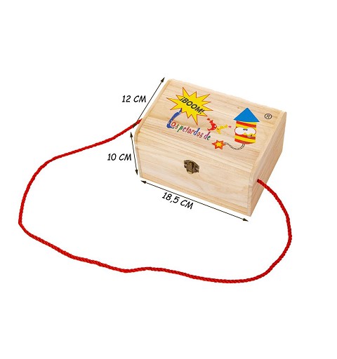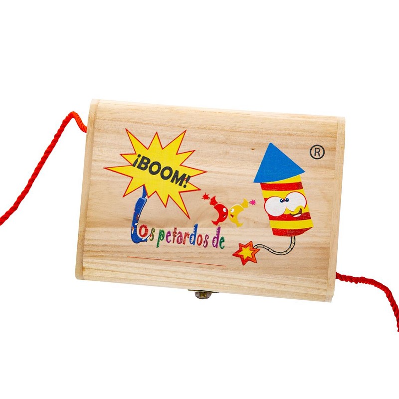 Con un tamaño de 18.5 x 12 x 10 cm te presentamos esta cajita de madera, decorada con motivos falleros, pensada para que los pequeños artificieros de la casa puedan guardar en ella sus petardos. Además, se puede personalizar con su nombre, dándole un toque realmente único y personal por un costse de 1.10 euros.