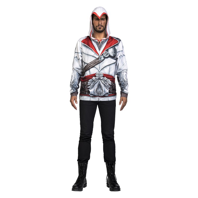 Para tu próxima fiesta de disfraces, Carnaval, o Halloween, transfórmate rápidamente en uno de los protagonistas de la famosa saga Assassin´s Ceed con esta camiseta, estampada y con capucha. Se trata de un producto oficial de esta famosa saga.