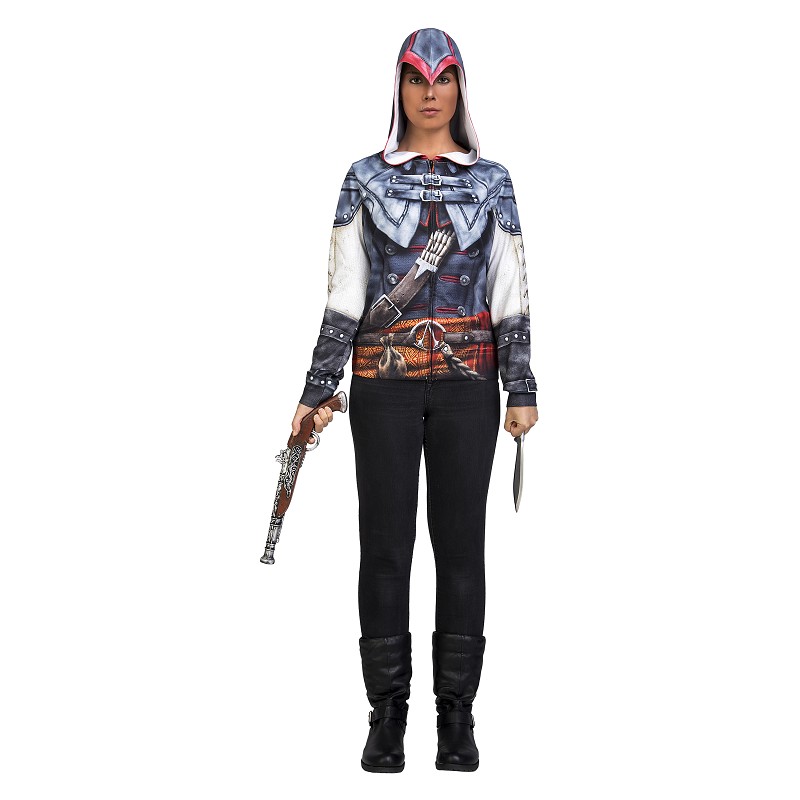 A tu próxima fiesta de disfraces, Carnaval o Halloween, podrás aparecer como Aveline De Grandprè, la primera protagonista de la serie de videojuegos Assasin´s Creed, una asesina francesa reclutada para defender a los esclavos y luchar por la libertad, y todo con sólo ponerte esta camiseta con capucha estampada. Seguro que harás una entrada triunfal....