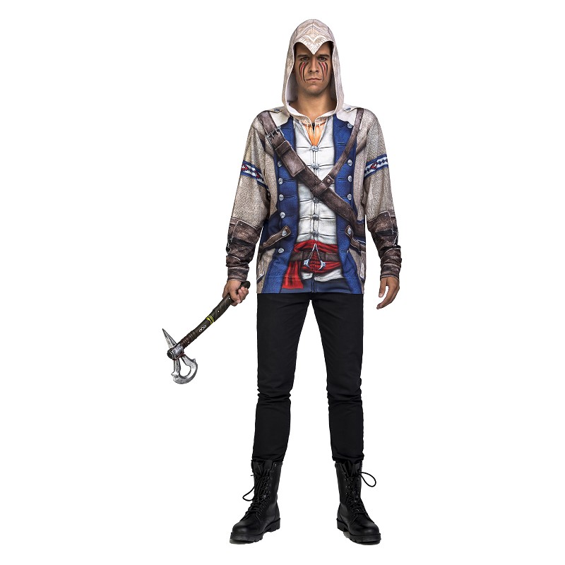 Con esta camiseta estampada y con capucha, que además es producto oficia, te transformarás rápidamente en Ratonhnhaké Ton, uno de los protagonistas de Assassin´s Creed, la famosa película y saga de viedojuegos. Es una eleccíon ideal para tu próxima fiesta de disfraces, Halloween o Carnaval.