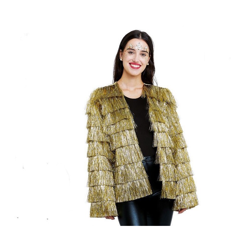 Disponible en talla única, y pensada pra festivales, despedidas, fiestas de disfraces, navideñas, o cualquier otro evento que se te ocurra, te presentamos esta chaqueta con flecos, toda en tonos dorados, con la que estarás realmente impresionante!!!