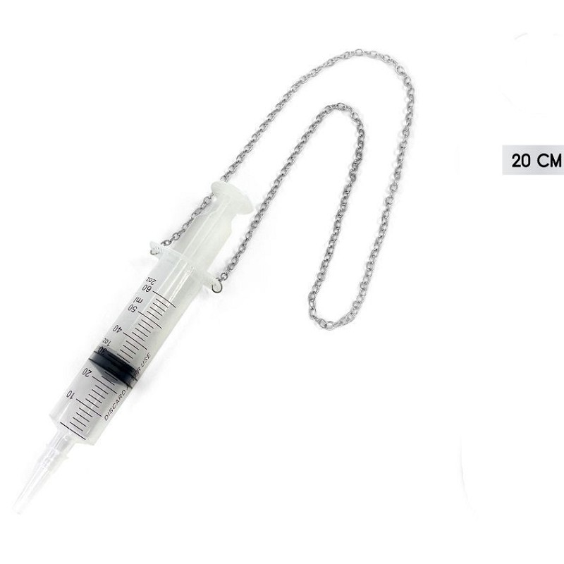 Collar con diseño de jeringuilla, de 20 cm de longitud, ideal como complemento para disfraces de Halloween, médicos locos, zombies o temáticos de terror. Su estilo llamativo y original aporta un toque divertido y espeluznante al atuendo, destacando en fiestas y eventos. Ligero y cómodo de llevar, se coloca fácilmente alrededor del cuello. Un accesorio único que completará cualquier disfraz con creatividad y un toque atrevido, perfecto para destacar.....