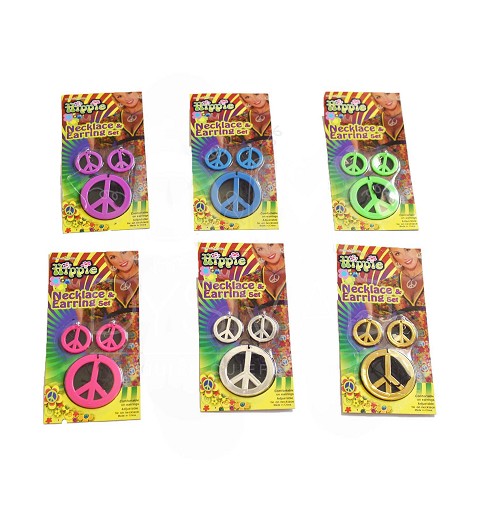 Si en tu próxima fiesta de disfraces la temática es "hippie" no te puede faltar este set, compuesto por collar y pendientes, disponibles en colores surtidos, pero todos vivos y llamativos, con el simbolo inequívoco de la paz, algo tan característico de este famoso movimiento, con el que seguro, desprenderás paz y amor!!