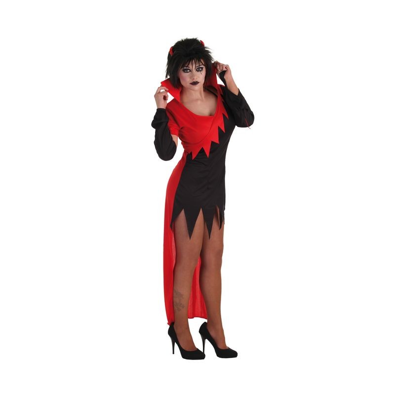 La noche de Halloween se presenta muy, muy caliente si sales a la calle con este disfraz de diabla. Compuesto por un mini vestido de picos, drapeado a dos colores, negro y rojo, de corte asimétrico y con una parte delantera corta no, cortísima. Incluye manguitos y cuernos para poner la fiesta de Halloween al rojo vivo