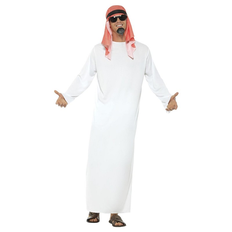 Compuesto por una sencilla, pero característica túnica larga y un pañuelo, tenemos este disfraz de jeque árabe para adulto, disponible en varias tallas, con el que parecerás un auténtico lider en tu próxima fiesta de disfraces, como, recién llegado del mismísimo Dubai....