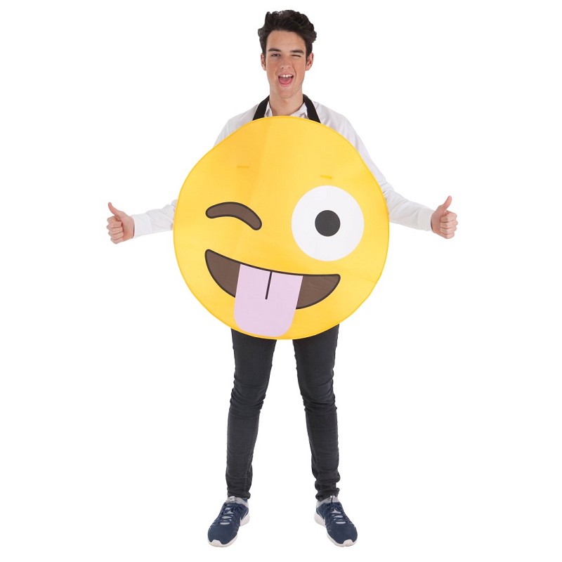 Conviértete en uno de los singulares personajes de la nueva película EMOJI, basada en los emoticonos del whatsapp con este sencillo pero expresivo disfraz de guiño.