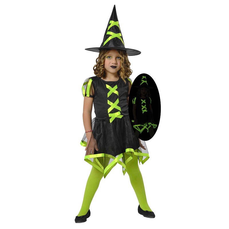 Este, el disfraz de Bruja Cuca, pensado para niñas, es una elección de lo más original!! Está disponible en varias tallas y compuesto por vestido y sombrero, y que además, incluye una divertida sorpresa!! Una telaraña luminiscente que brilla en la oscuridad, ideal para las peques de 3 a 10 años que deseen lucir un aspecto realmente mágico y divertido en Halloween, o en alguna otra ocasión especial!!!