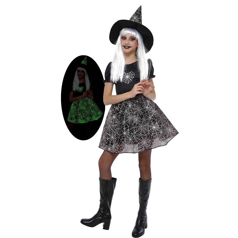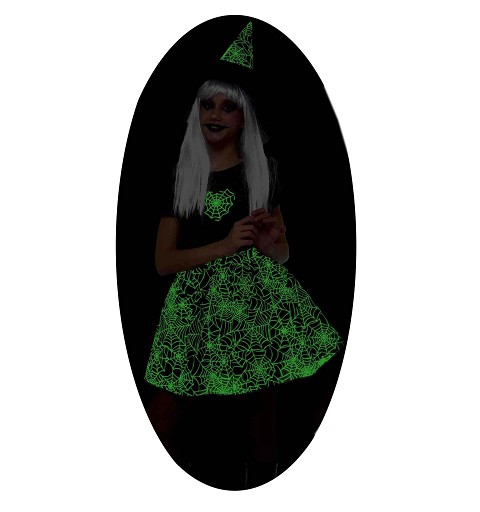- Disfraz de Bruja con Telaraña que brilla en la oscuridad.