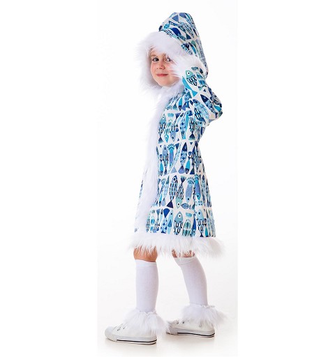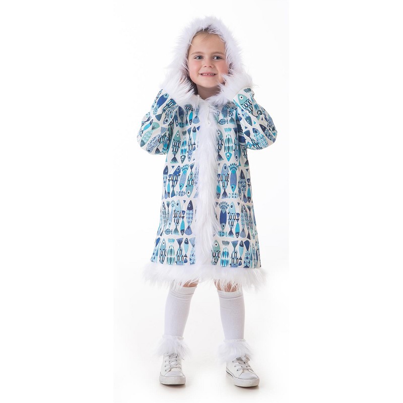 Disponible en varias tallas, 1, 3 y 5, y compuesto por un elegante vestido blanco y azul con capucha, decorado con simpáticos pececitos, y a juego con las polainas, te presentamos este adorable Disfraz de Esquimal para niña. Es de fabricación nacional y su diseño está inspirado en la cultura esquimal, los pueblos indígenas que habitan en Siberia y América del Norte, por lo que es una perfecta elección para el próximo carnaval, fiestas temáticas o de disfraces. Además, este modelo está disponible para mujer, hombres, niños y bebés, por lo que es una perfecta elección para grupos o familias.