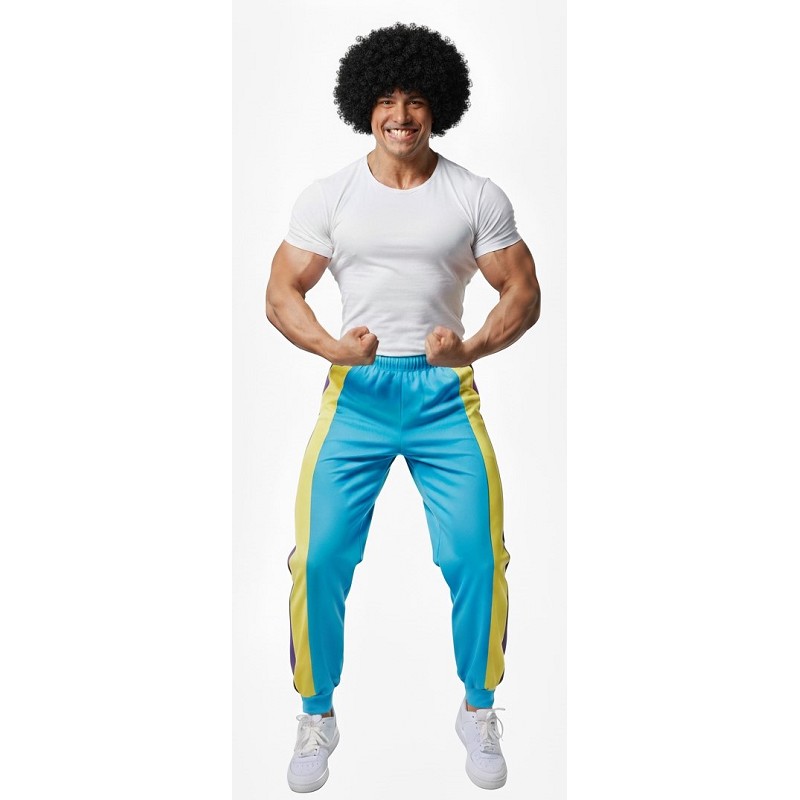 Si quieres recrear el ambiente deportivo y desenfadado de la decada de kis 80, te presentamos este Disfraz de Años 80 Gimnasia para Hombre. Incluye un pantalón de chándal de punto cómodo y vistoso, junto con una peluca rizada negra que completa el look retro. Su fabricación nacional garantiza calidad y buen acabado. Este modelo también está disponible para mujer, niño y niña, ideal para disfraces coordinados en fiestas temáticas.