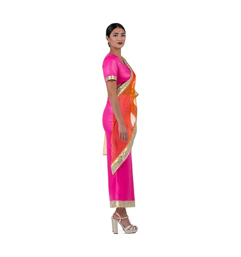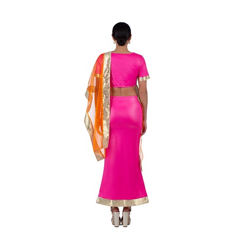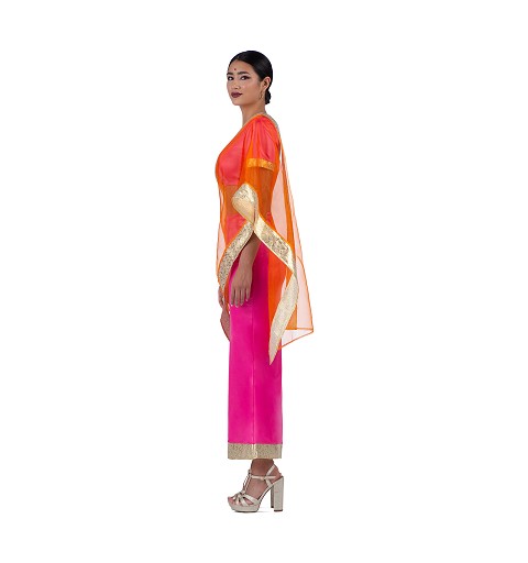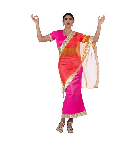 El hinduismo o religión hindi es una de las principales religiones del planeta, nacida en el subcontinente Indio, y es además, una de las más antiguas y complejas, y de la que parecerás formar parte gracias a este logrado disfraz de mujer hindú, compuesto por top, falda y chal, y con el que sólo te faltará el bindi, el punto rojo en la frente, considerado como el sexto chakra.....