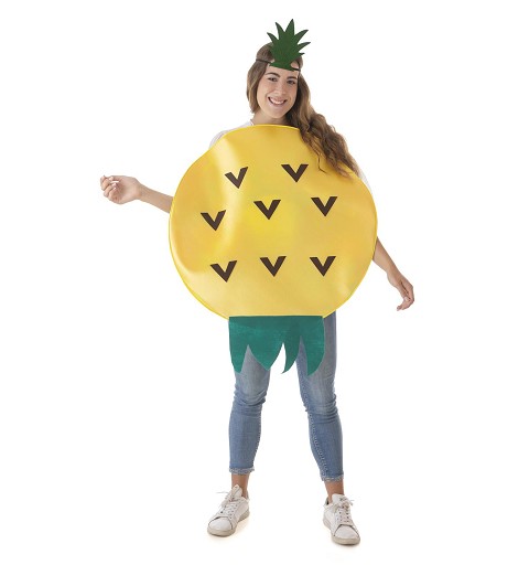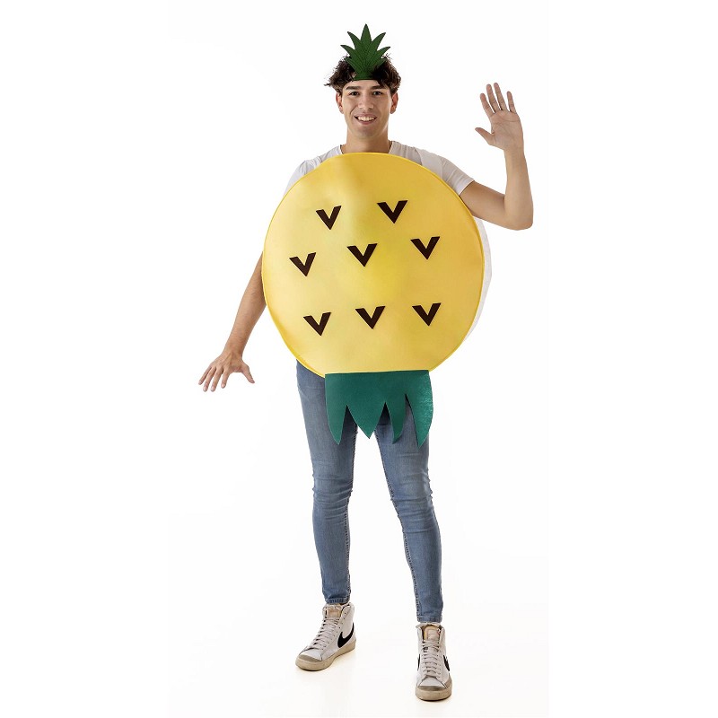 Totalmente unisex te presentamos este Disfraz de Piña para Adultos, perfecto para destacar en cualquier fiesta de disfraces. Incluye un cuerpo con el diseño de piña, que ofrece un look fresco y divertido, junto con una diadema que simula la característica corona de la fruta. Es cómodo y original, ideal para quienes buscan una opción apetecible y alegre para celebraciones temáticas, carnavales o fiestas veraniegas. ¡Serás la piña de la fiesta!