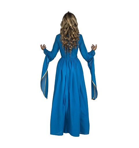 Inspirado en las modas y tendencias de la edad media, en tonos azules y dorados, largo hasta los pies y con unas vistosas mangas acampanadas, te presentamos este precioso disfraz de princesa medieval para mujer, compuesto por vestido y diadema, con el que sin duda, parecerás una auténtica reina....