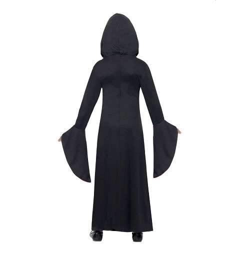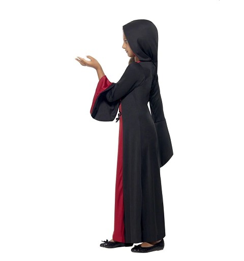 Pensado para niñas de 7/9 y 10/12 años, te presentamos este espectacular disfraz de vampira, compuesto por un vestido largo, hasta los pies, con capucha y unas grandes mangas acampanadas, combinado en rojo y negro, más que perfecto para su próxima fiesta de Halloween!!!!