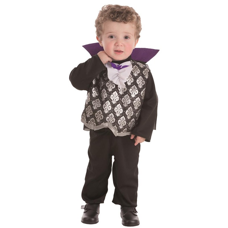 Una bonita camisa, con el pecho decorado con motivos plateados, una capa con el cuello lila, y un pantalón negro componen este disfraz de vampiro para que los peques, de 1 a 2 años disfruten de Halloween, pidan truco o trato o vayan a su próxima fiesta, bien en casa, en casa de amigos o en la guarde. Con este disfraz, además de cómodos, irán graciosos y elegantes, y se parecerán, sin ninguna duda, al mismísimo Conde Drácula....