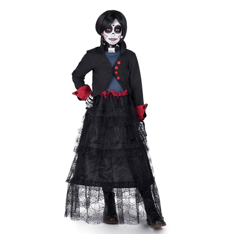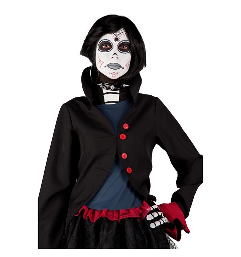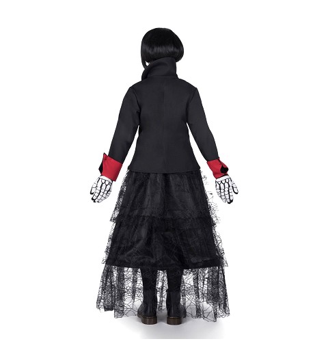 - Incluye: Vestido, chaqueta, guantes, chorrera esqueleto, gargantilla, peluca, tatoo y esponja con pastilla blanca.