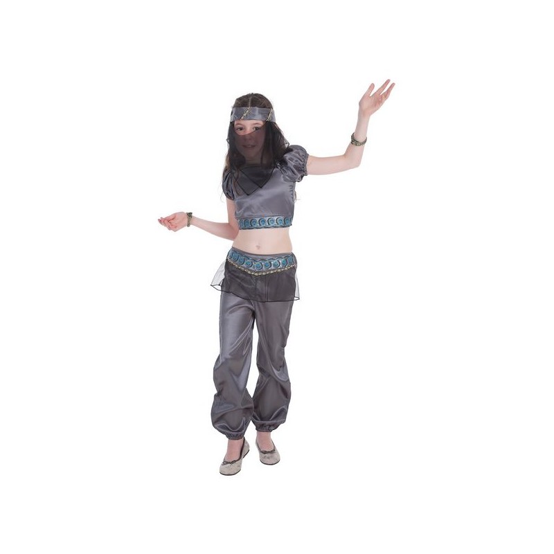 Disfraz infantil de princesa mora original, sencillo, económico y muy resultón, con el que podrás recrear los cuentos de las Mil y una noches, llenos de historias de amor, tragedias, comedias, poemas, parodias, leyendas... o vivir aventuras propias de la princesa Jasmine. Compuesto por corpiño, pantalones bombachos y el tradicional velo