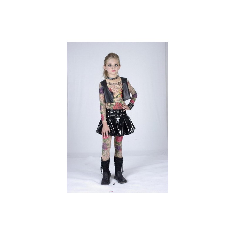 Viste a tu hija de rockera con este atrevido disfraz, y para colmo, llénala de tatuajes con esta camiseta tan peculiar. Será la "chica" más dura de estos carnavales.