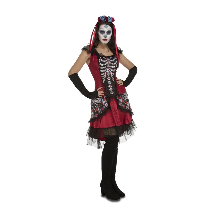 Este disfraz de Sugar Skull para mujer es perfecto para la celebración del Día de Muertos, Víspera de Todos los Santos o Halloween. Incluye un elegante vestido que combina elementos festivos con un diseño sexy y femenino, ideal para quien quiera destacar en una fiesta temática. El vestido está adornado con detalles que evocan el arte tradicional de las calaveras mexicanas, tan típicas de esta celebración. El conjunto se completa con un tocado festivo que recuerda a las flores de cempasúchil y unos manguitos que añaden un toque cómodo y desenfadado al look.
