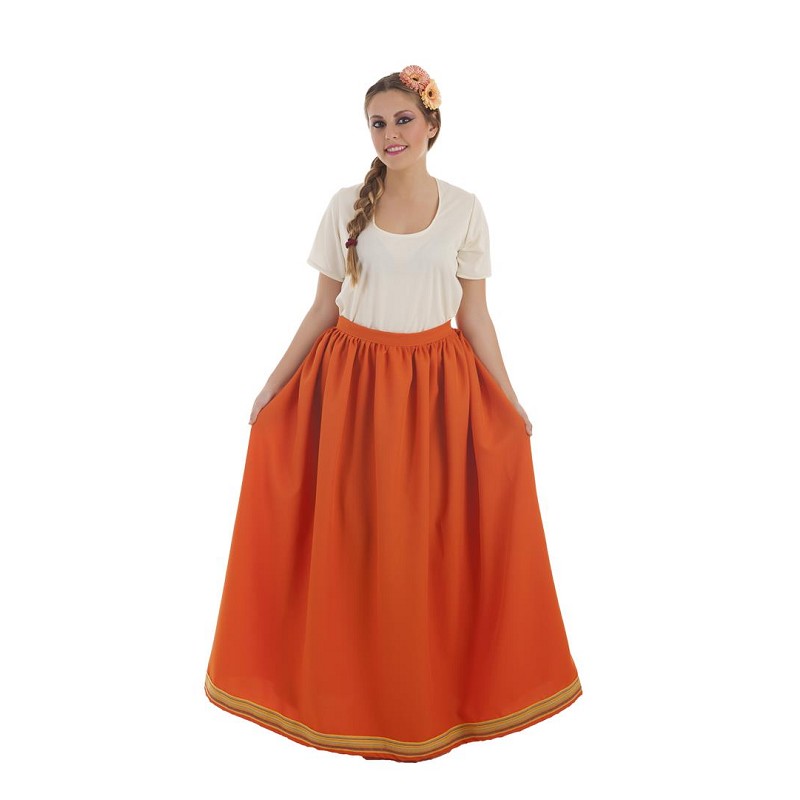 De color naranja es esta falda, confeccionada en tela de tejido regional, como si fuera auténtica de la época, ideal para ferias o mercadillos medievales y fiestas temáticas, que aparecen con la llegada del buen tiempo. Combínala con una simple camiseta, y con ella irás cómoda, fresquita, como si vinieses del medievo...