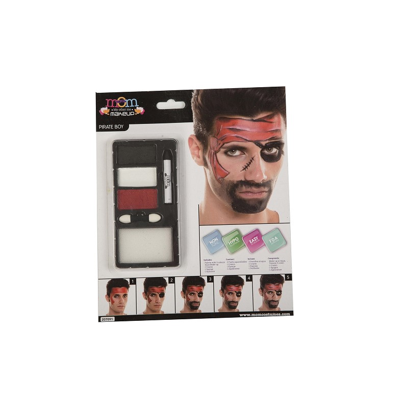 Si tu disfraz es de temática pirata, no lo dudes y completa tu imagen con un poco de maquillaje, como con este kit,  que incluye 3 colores distintos, pincel, esponja, perfilador, y una pequeña guía explicativa indicándote los pasos a seguir. Con el maquillaje y un sencillo disfraz, estarás más que listo para abordar lo que se te presente....