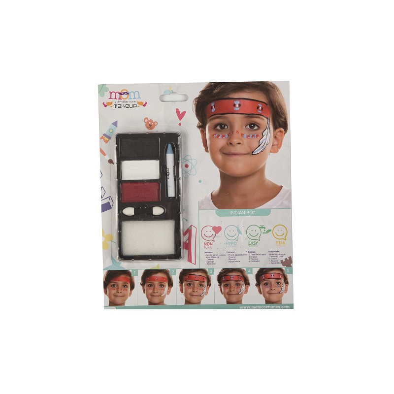 Una paleta con tres colores, pincel, esponja, perfilador y una guía explicativa componen este kit de maquilllaje infantil, ideal para transformar a tu peque en un gracioso indio para su próxima fiesta de disfraces, cumpleaños o carnaval.