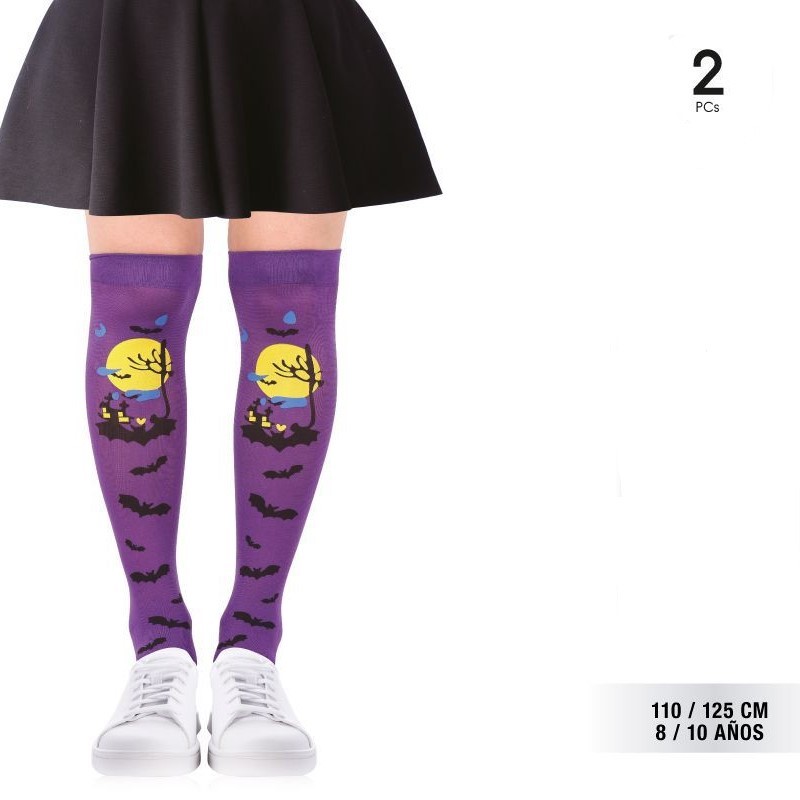 Medias calcetín infantiles en color morado con divertidos murciélagos, perfectas para añadir un toque especial a los disfraces de Halloween. Con una medida de 110/125 cm, son ideales para niños de 8 a 10 años, ofreciendo comodidad y un ajuste adecuado. Su diseño original y festivo convierte este complemento en una opción práctica, original y llamativa para fiestas, eventos escolares o celebraciones temáticas. Un accesorio diferente, cómodo y lleno de espíritu halloweenesco.....