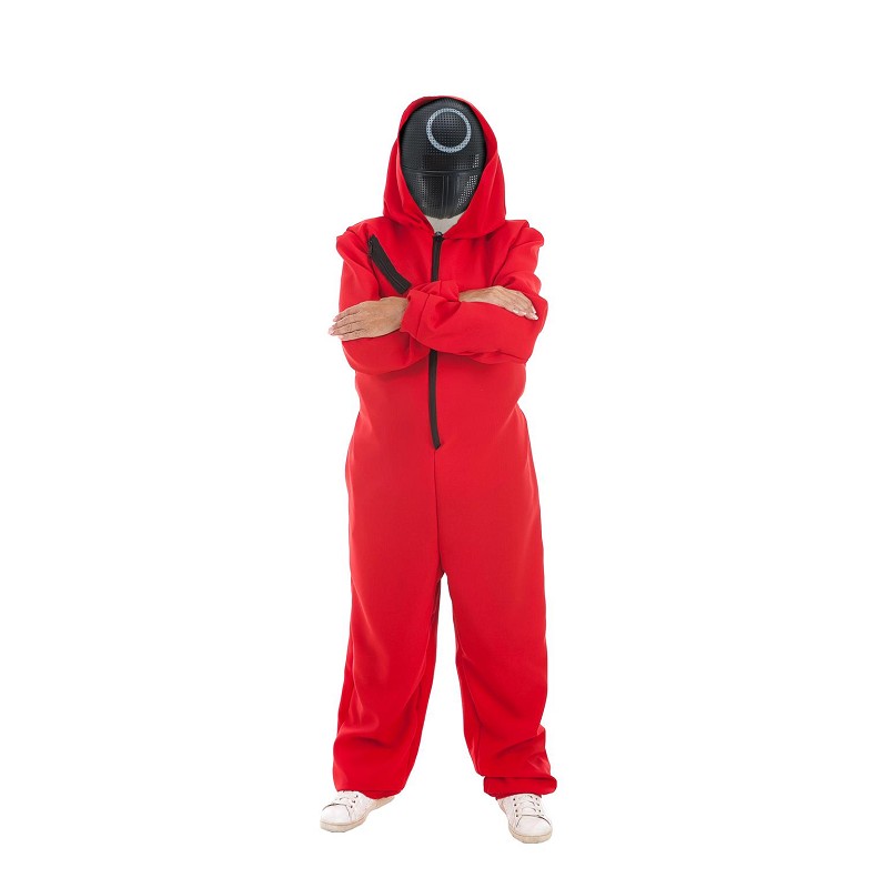 Si te gusta ir a la última y sorprender a todos en tu próxima fiesta, no te lo pienses, ya que te presentamos el disfraz de moda, compuesto por mono y máscara, ya sea de círculo, triángulo y cuadrado, tu eliges, y con el que, sin ningua duda, recordarás al famoso Juego del Calamar. Te atreves a transformarte en este terrorífico personaje????