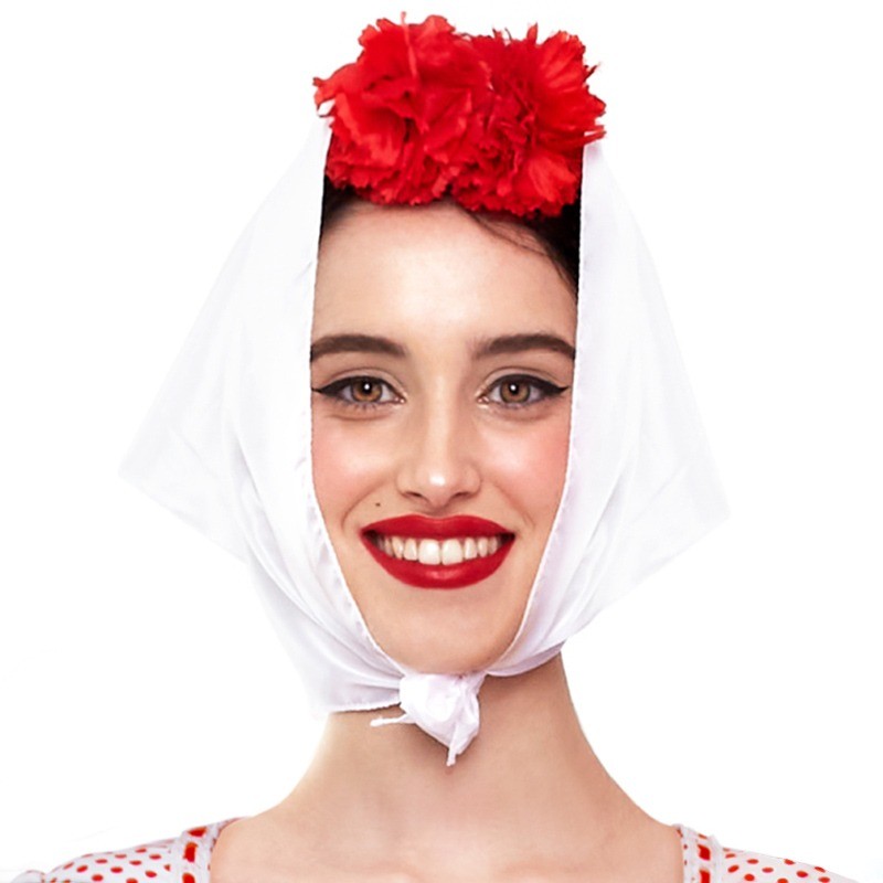 Estas próximas fiestas de San Isidro no te puede faltar un complemento como este, el pañuelo blanco para la cabeza, un pequeño detalle que transformará por completo tu aspecto, y que junto al clavel rojo, te dará un apecto de castiza total, ideal para disfrutar de fiestas tan especiales como en La Paloma, La Almudena y como no, la de San Isidro.