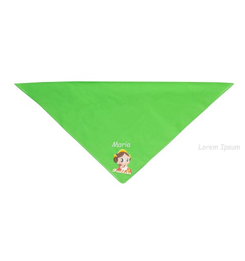 Con unas dimensiones de 53 x 53 cm te presentamos este bonito pañuelo en color verde pistacho, decorado únicamente con una pequeña fallera y en el que podemos bordar el nombre que nos indiques, dándole así un toque muy personal, para que no te falte ni el más mínimo detalle en tu próximo evento fallero.