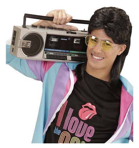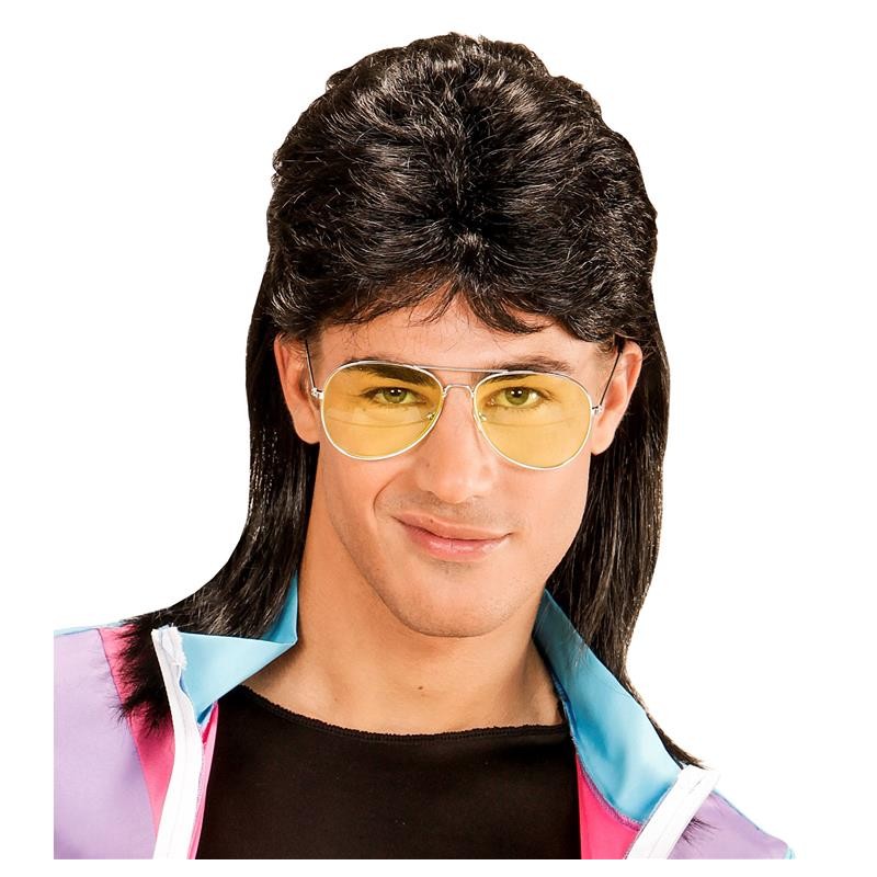 Peluca estilo Mullet Negra Años 80S con Gafas