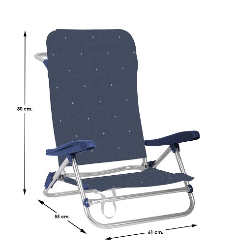 Con unas dimensiones de 55 x 61 x 80 cm te presentamos esta silla de playa baja de aluminio en azul y brillo, ideal para disfrutar de la playa, la arena y las vacaciones. Su estructura de aluminio garantiza ligereza y durabilidad, mientras que el acabado en azul brillo le da un toque vibrante y elegante. Su diseño ofrece comodidad, estilo y un toque refrescante para relajarse bajo el sol.....