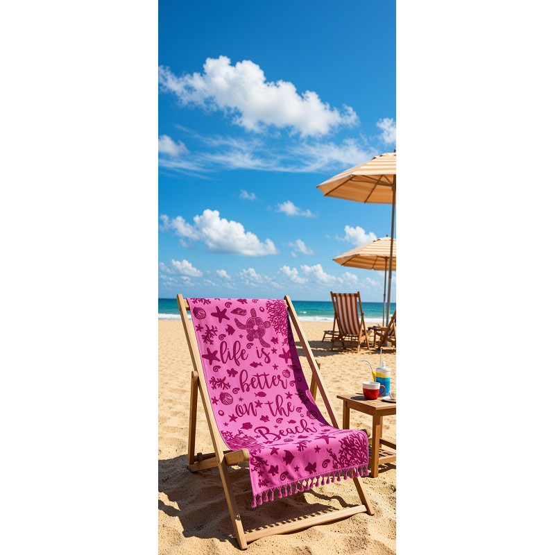 Su acabado con flecos decorativos aporta un toque elegante y artesanal, ideal tanto para la playa como para la piscina o el spa. Ligera pero resistente, se seca rápidamente y mantiene su textura agradable lavado tras lavado.
