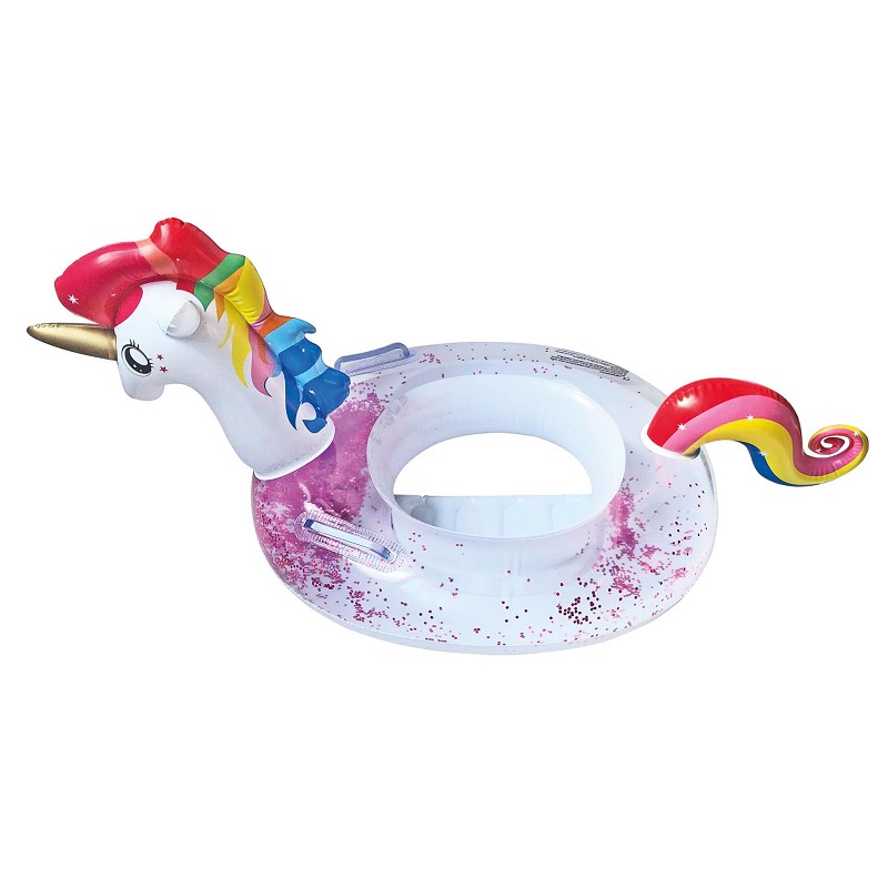 Un alegre y simpático unicornio es la forma de este divertidísimo flotador con asas, pensado para disfrutar de alegres y divertidos momentos de baño rodeados en buena compañia...