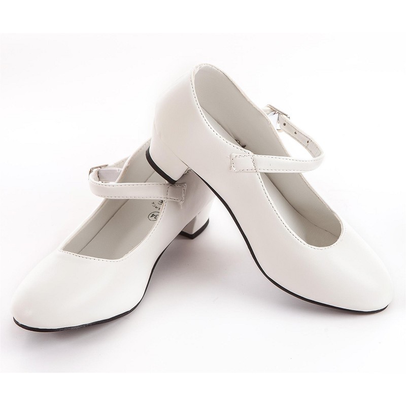 Con un tacón de 4 centímetros, y de un impoluto color blanco tenemos estos bonitos zapatos, disponibles en varias tallas, que van desde la 20 hasta la 41, y que están confeccionados en polipiel, con suela de pvc, y con los que darás un aire de lo más elegante a tu disfraz....
